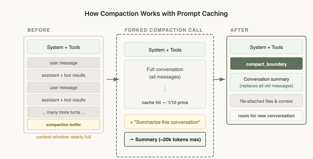 Kontekst oynasi to'lib qolganda, suhbatni qisqartirish (compaction) talab etiladi. Odatda bu alohida API so'rovi orqali amalga oshiriladi, lekin bu ham keshni buzishi mumkin. Yechim sifatida Claude Code «Cache-Safe Forking» usulini qo'llaydi: zichlashtirish so'rovi uchun ham asosiy suhbatdagi prefiks, tizim prompti va instrumentlar aynan bir xil holatda ishlatiladi.